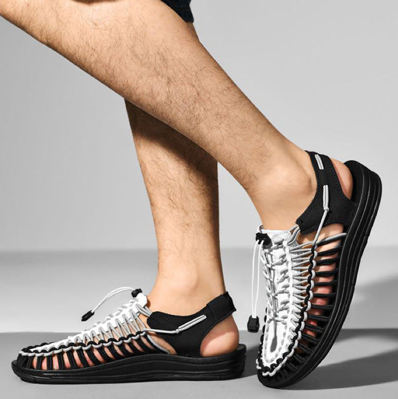 Odkryj najlepsze letnie obuwie dzięki naszym sandałom męskim, które łączą innowacyjny styl i wygodę. Charakteryzujące się unikalnym tkanym wzorem, sandały te oferują świeże i nowoczesne podejście do klasycznego letniego wyglądu. Regulowane nylonowe sznurowadła zapewniają idealne dopasowanie i dopasowanie do stopy, zapewniając wygodę. Oddychająca konstrukcja zapewnia stopom chłód i wygodę, dzięki czemu są one niezbędnym elementem letniej garderoby - idealnym na plażowe przygody lub swobodne spacery.